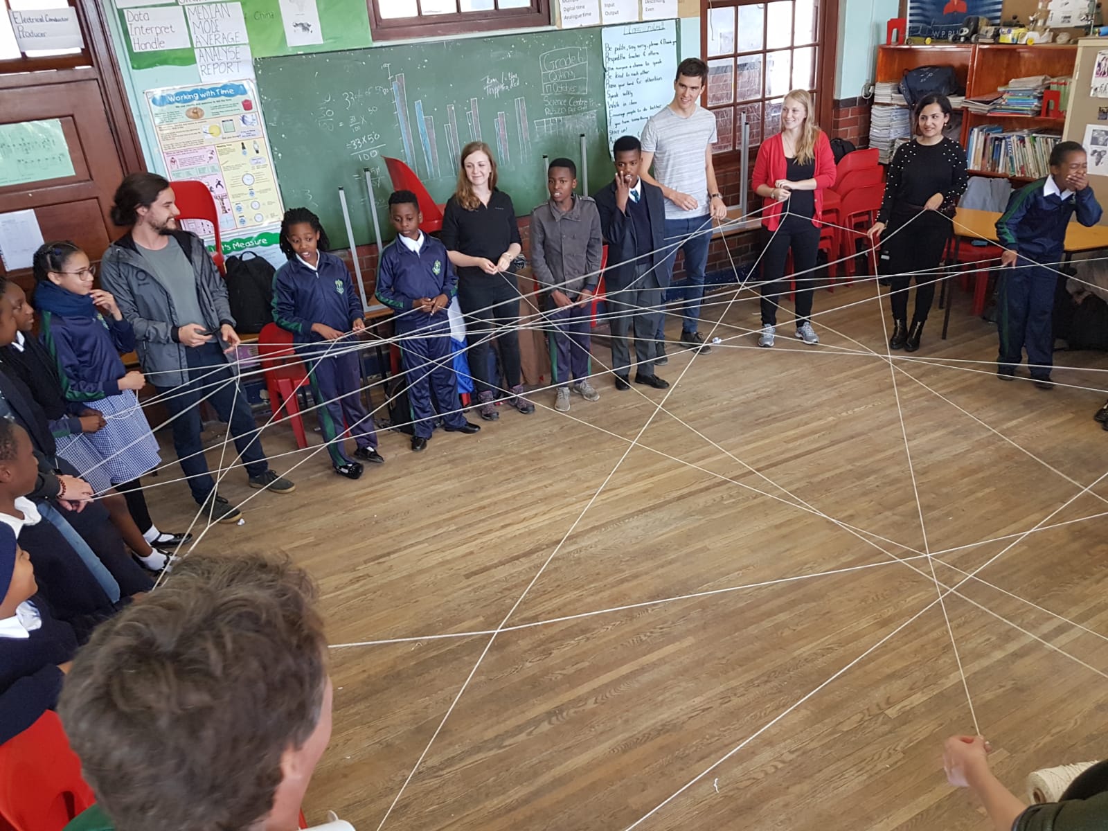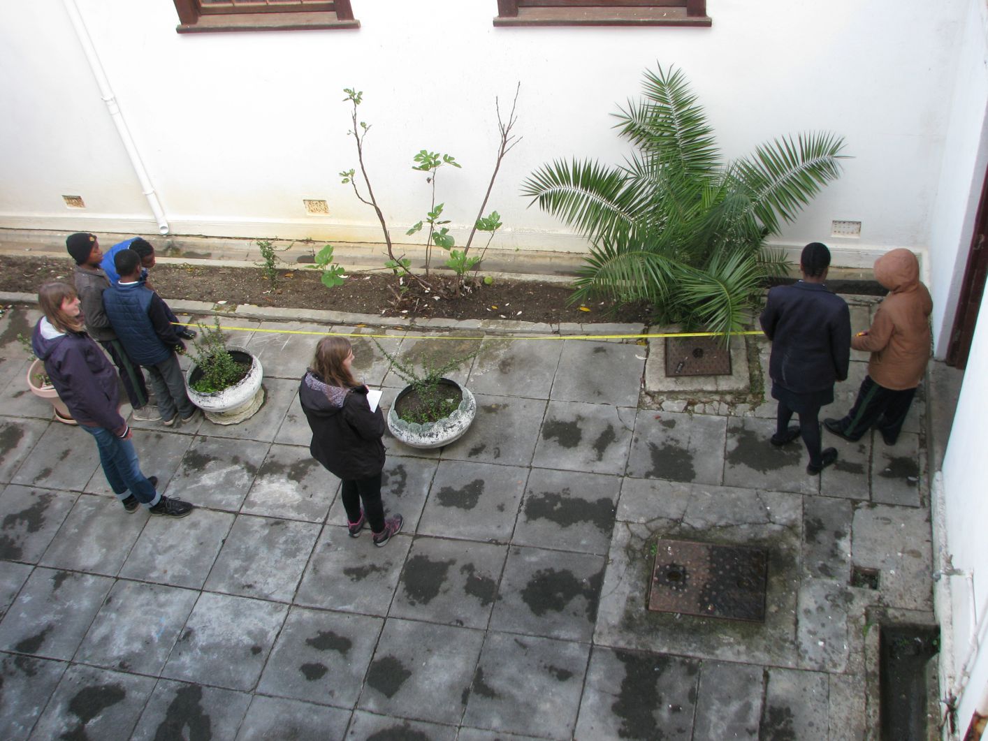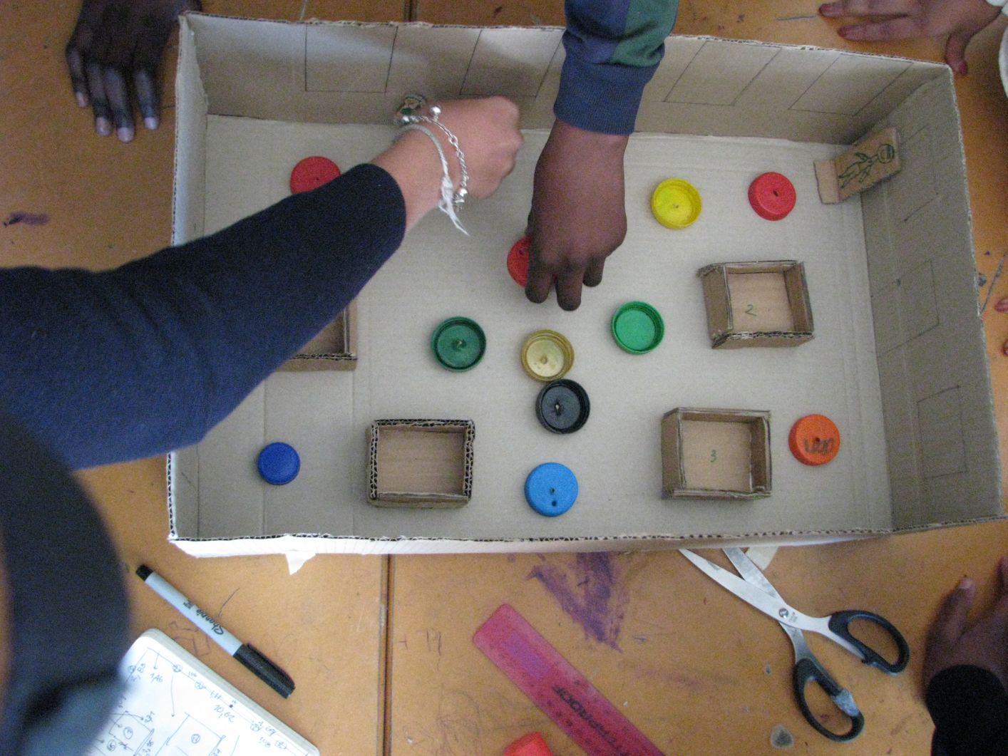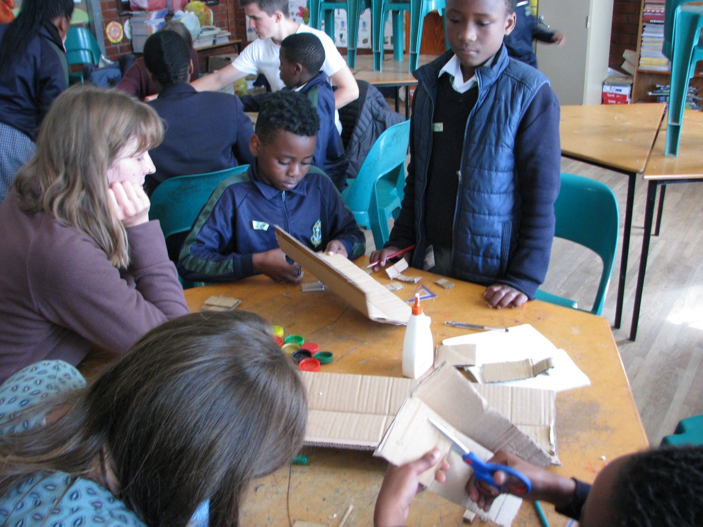 In der Schule wurde entschieden, die Hochbeete in den beiden Innenhöfen aufzustellen. Neben den Hochbeeten wurde die Idee von Ikhaya Gardens aus Autoreifen mit Hilfe von Wäschekordeln Sitzgelegenheiten zu bauen ins Projekt aufgenommen. In Absprache mit der Schulleiterin und dem Klassenlehrer formierte sich eine Gartengruppe aus 12 Kindern der 6. Klasse, mit denen die weitere Planung der Innenhöfe und auch der spätere Aufbau gemeinsam erarbeitet wurden. Gemeinsam wurden die beiden Höfe ausgemessen, Lieblingsgemüse und Obst gemalt und maßstabsgerechte simple Modelle von den Innenhöfen gebaut. Es war besonders schön zu sehen wie die Kinder am Ende verstanden haben, wie man mit den Modellen die Gestaltung der Innenhöfe planen kann.