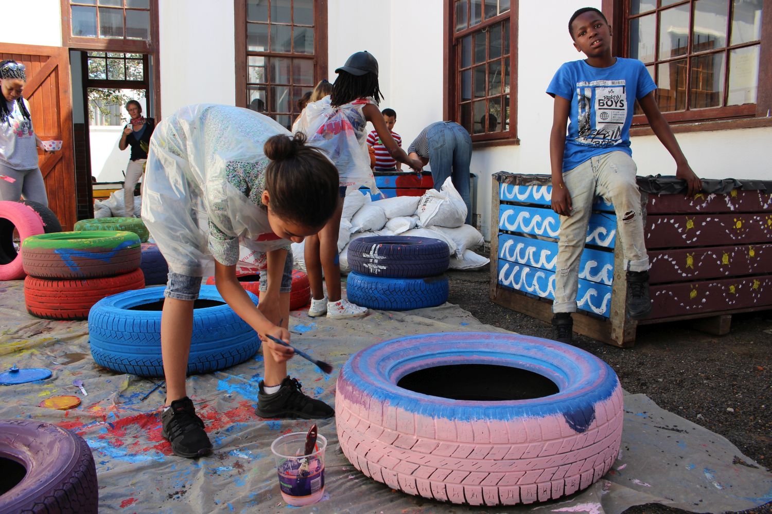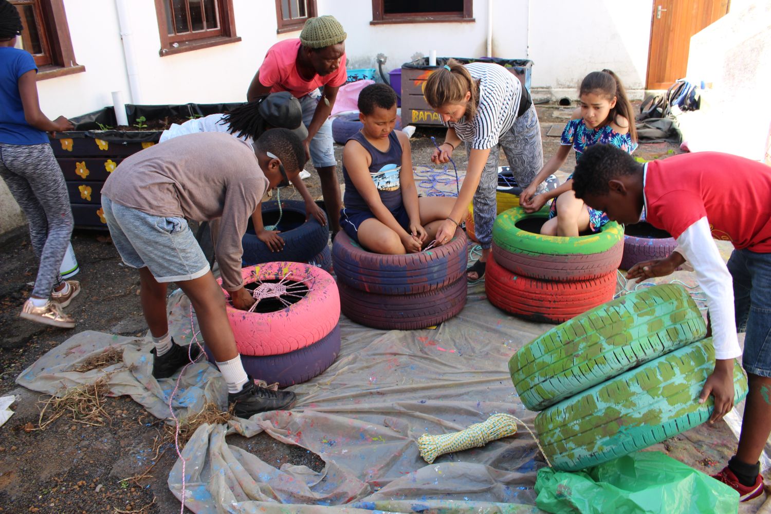 Am letzten Bautag wurden die Kisten und Reifen mit Erde und Kompost befüllt und mit den Pflanzen, die die Kinder sich gewünscht hatten bepflanzt: Erdbeeren, Ananas, Trauben, Möhren, Mangold, Fenchel, Bohnen, Zucchini, Kürbis, Salat, Zwiebel und Küchenkräuter. Außerdem war Xolisa Bangani von Ikhaya Gardens aus Khaylitsha gekommen, um den Kindern beizubringen, wie man Sitzgelegenheiten aus Reifen baut. Selbst einige Eltern, die zum Abholen der Kinder gekommen waren, halfen mit alles fertig zu stellen!