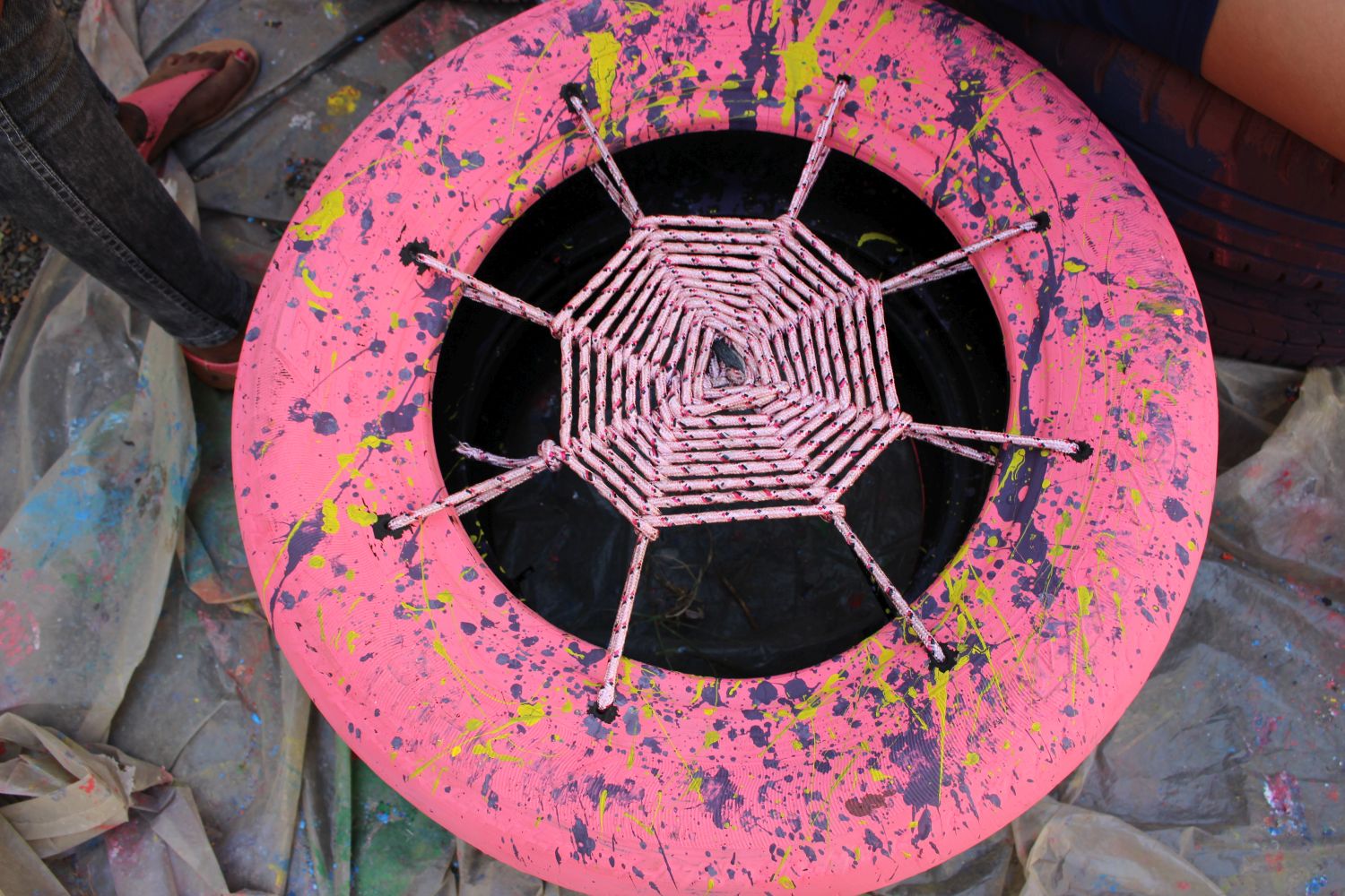 Die Bauphase des Projekts fand während der Schulferien statt. Dazu hatten die Eltern eine spezielle Genehmigung für die Kinder erteilt. Die angelieferten Obstkisten wurden zuerst gemäß den Plänen und Modellen in den beiden Innenhöfen der Schule arrangiert. Anschließend bemalten die Kinder die Obstkisten mit einer Grundierung und ersten Motiven. Am folgenden Tag standen zuerst die Autoreifen im Mittelpunkt. Diese wurden von den Schülern ganz bunt in allen möglichen Farben, die die Kinder selbst anmischten, bemalt, um daraus später Beete und auch Sitzgelegenheiten zu schaffen.