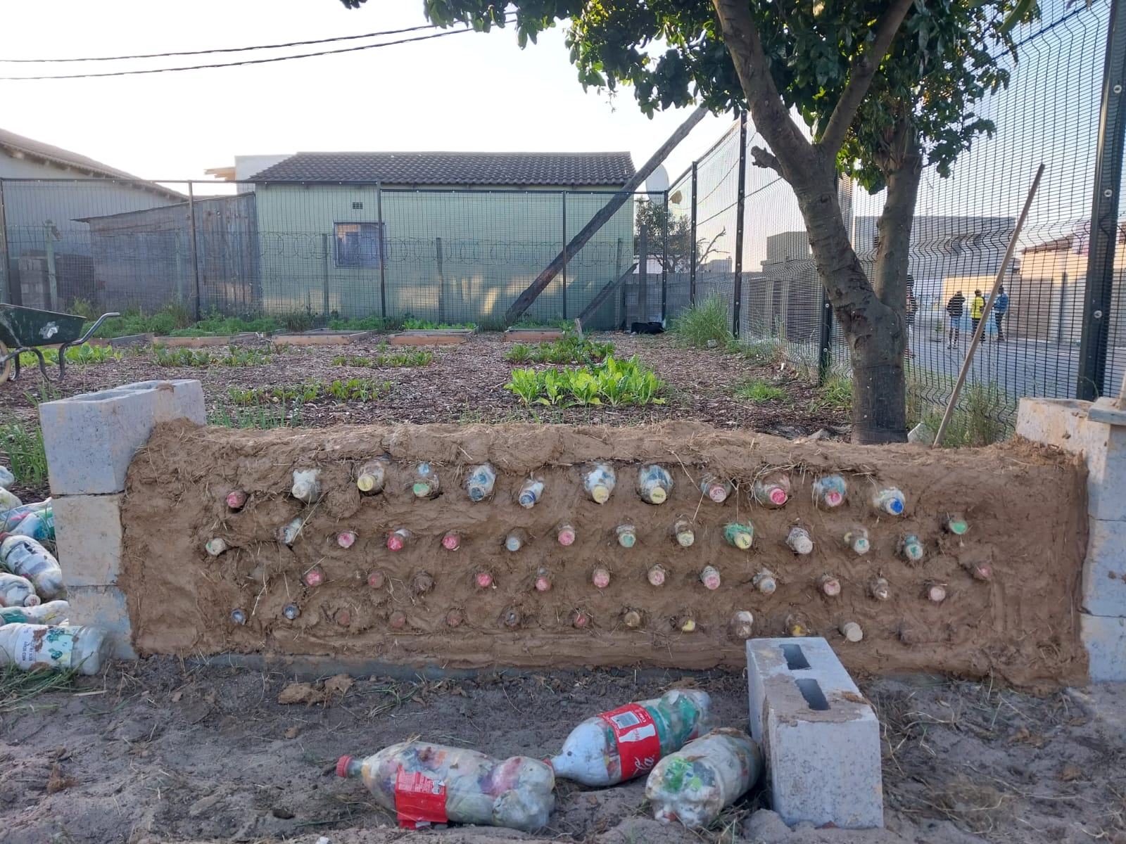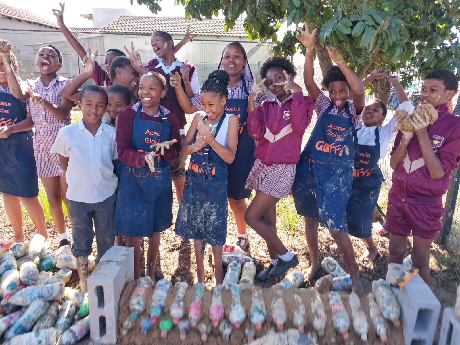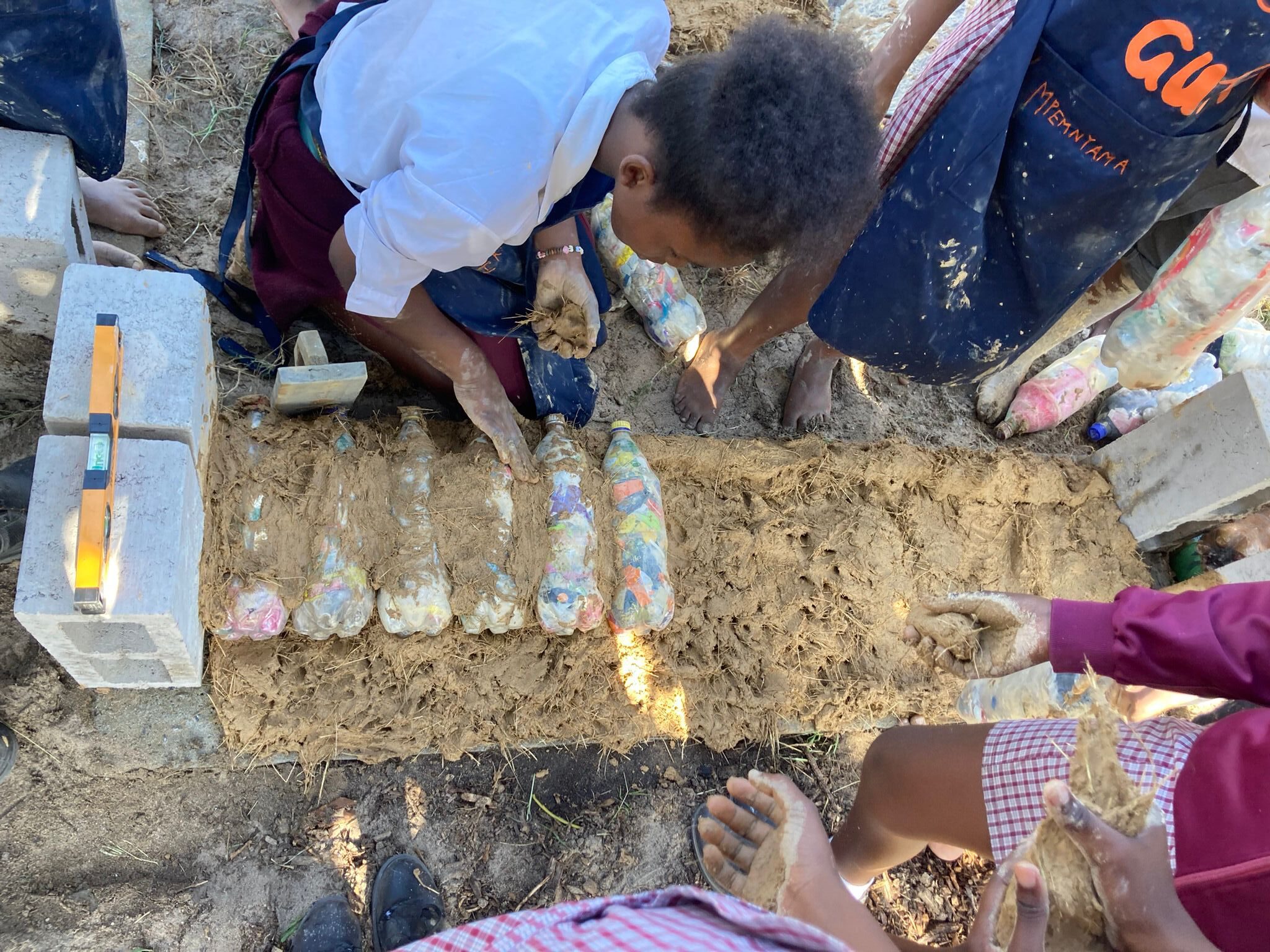 Wir begannen im Townhsip Nyanga und arbeiteten dort mit GUFFI (Gugulethu Urban Food Forest Initiative) zusammen. Während dieser Wochen konnten wir an der Mkhanyiseli Public Primary School in einem Öko-Club mithelfen, der ein Wahlfach am Nachmittag. Wir führten Workshops durch, um die Kinder für Themen wie nachhaltigem Konsum, Plastikverschmutzung und dem Abbau von Ressourcen zu sensibilisieren bzw. erstmalig in Kontakt zu bringen. Zum Abschluss bauten wir gemeinsam mit den Kindern eine Sitzbank für den Schulgarten aus sogenannten „Eco-Bricks” und einem Stroh-Lehm-Gemisch. „Eco-Bricks” sind Plastikflaschen, die wir gemeinsam mit den Kindern mit Plastikmüll füllten, den wir auf dem Schulgelände gesammelt hatten. Durch das starke Verdichten des Plastikmülls in den Flaschen, können diese als Baumaterial genutzt werden.