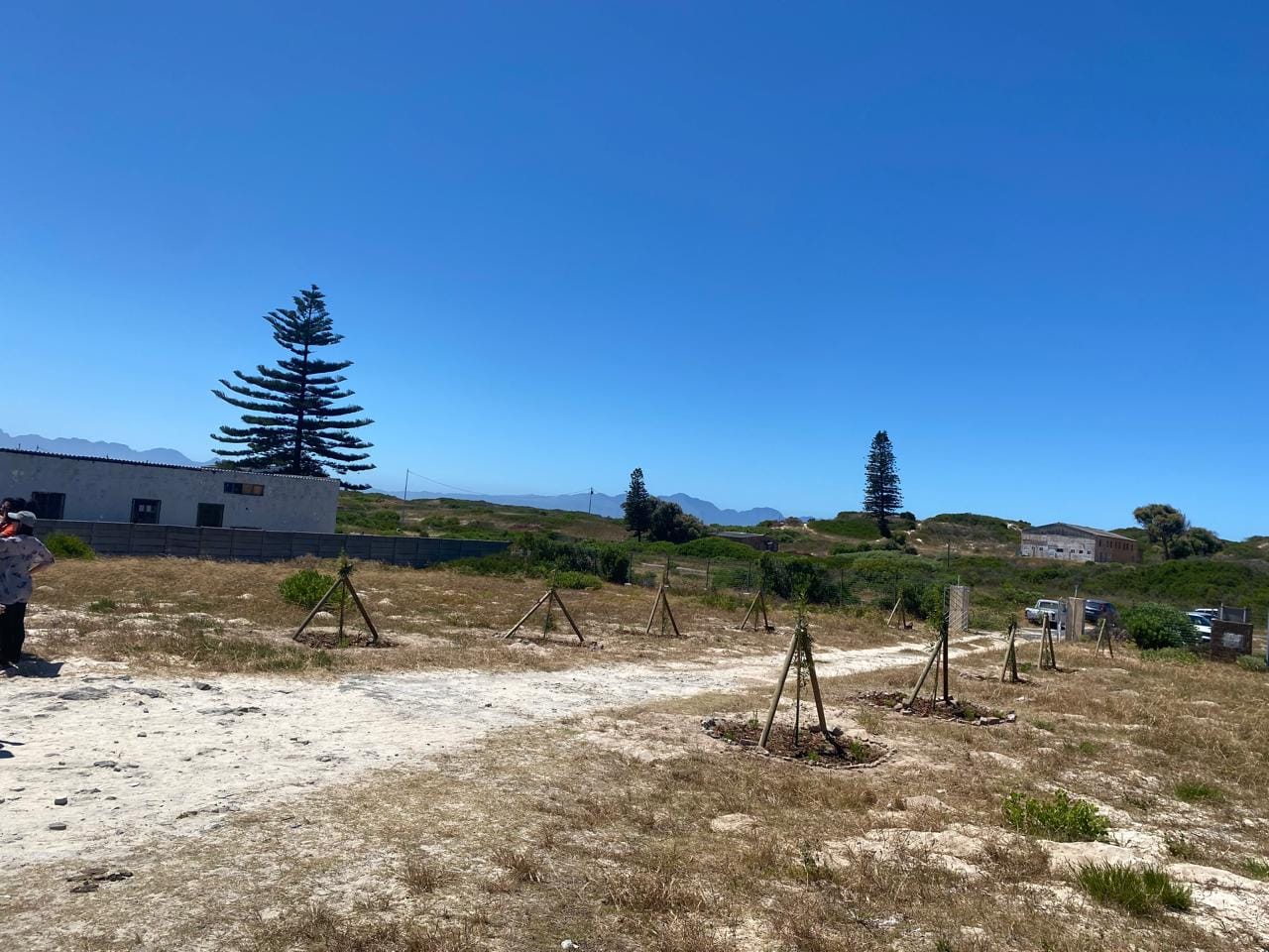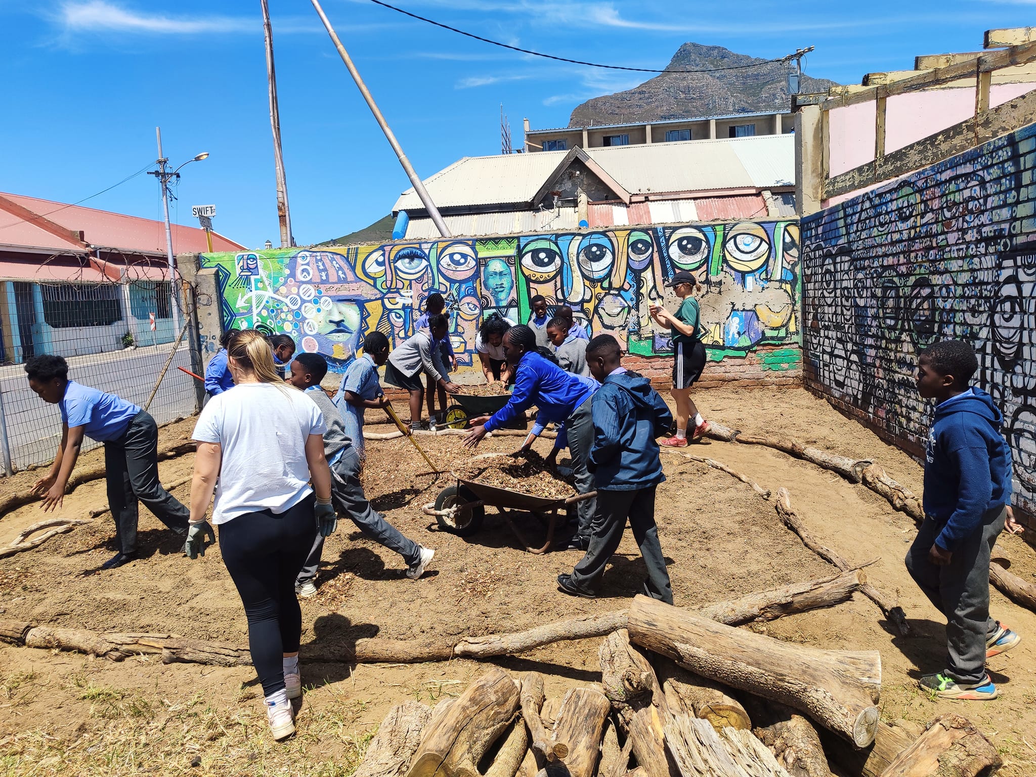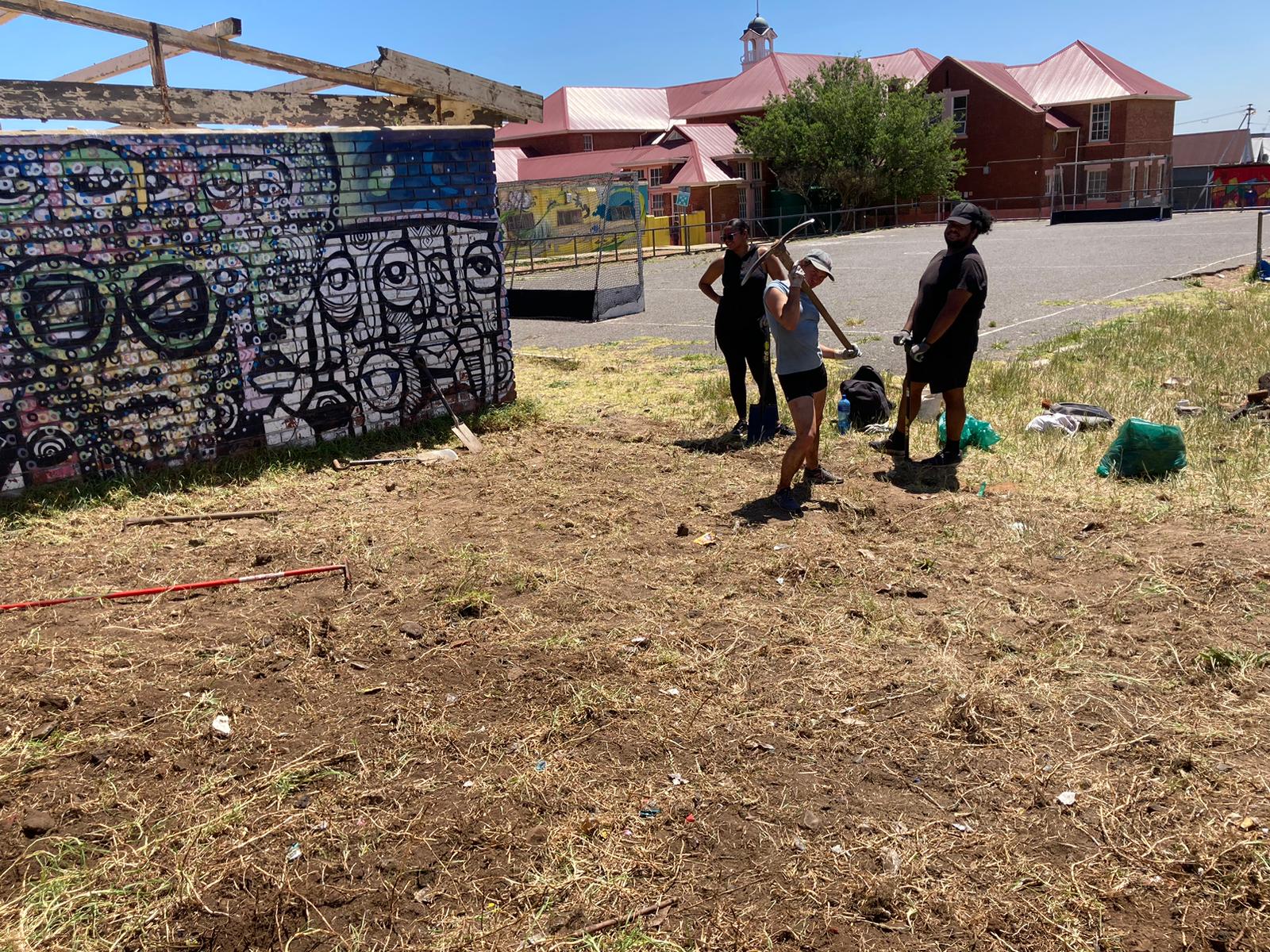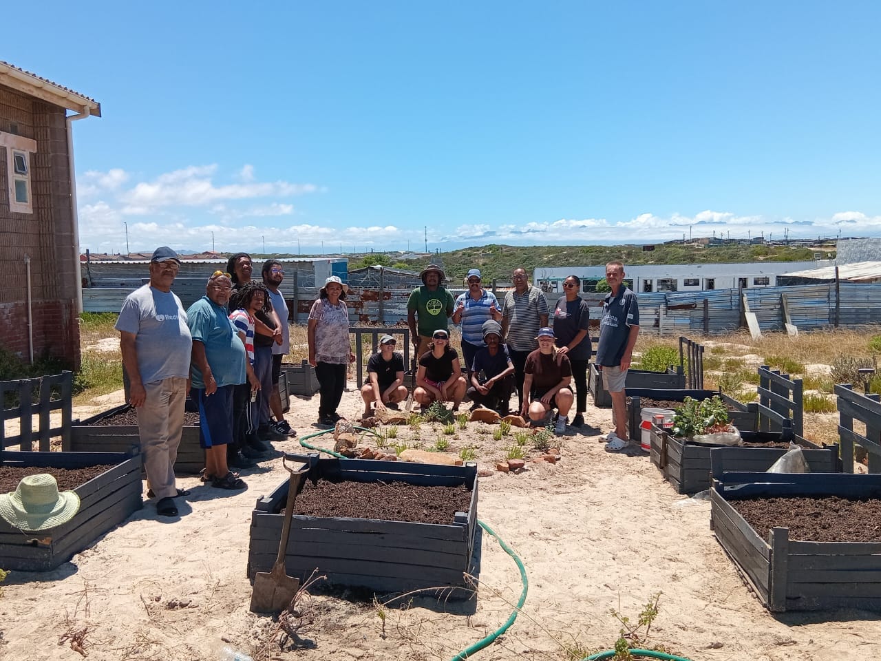 Das zweite Projekt in Kapstadt wurde von der Initiative „Neighbourhood Gardens“ organisiert und konzentrierte sich auch auf das Schulgelände der Dryden Primary School in Saltriver. Wir arbeiteten hauptsächlich ohne die Kinder und legten in einer Ecke des Schulhofs einen kleinen Schulgarten an. Da der Standort zuvor ungenutzt und stark vermüllt war, mussten wir sehr hart arbeiten, um am Ende einen wunderschönen Garten zu erhalten. Mit den Kindern pflanzten wir abschließend einheimische Pflanzen vom Kap an, die als Renosterveld-Vegetation bezeichnet werden und zur Fynbos-Familie gehören, die nur im Westkap Südafrikas wächst. Wir luden dazu eine Fynbos-Expertin ein, die den Kindern die nützlichen Eigenschaften der Pflanzen erklärte. Die Kinder werden in Zukunft die Verantwortung und Pflege des neu angelegten Gartens übernehmen. Nach dem erfolgreichen Einsatz an der Schule halfen wir beim Bau von Beeten in einem nahe gelegenen Garten aus, der zu den von der Organisation unterstützten Gärten gehört. Es war eine großartige Erfahrung, Einblicke in die Community zu bekommen und etwas über ihre Sorgen und Hoffnungen für ihr Viertel zu erfahren.