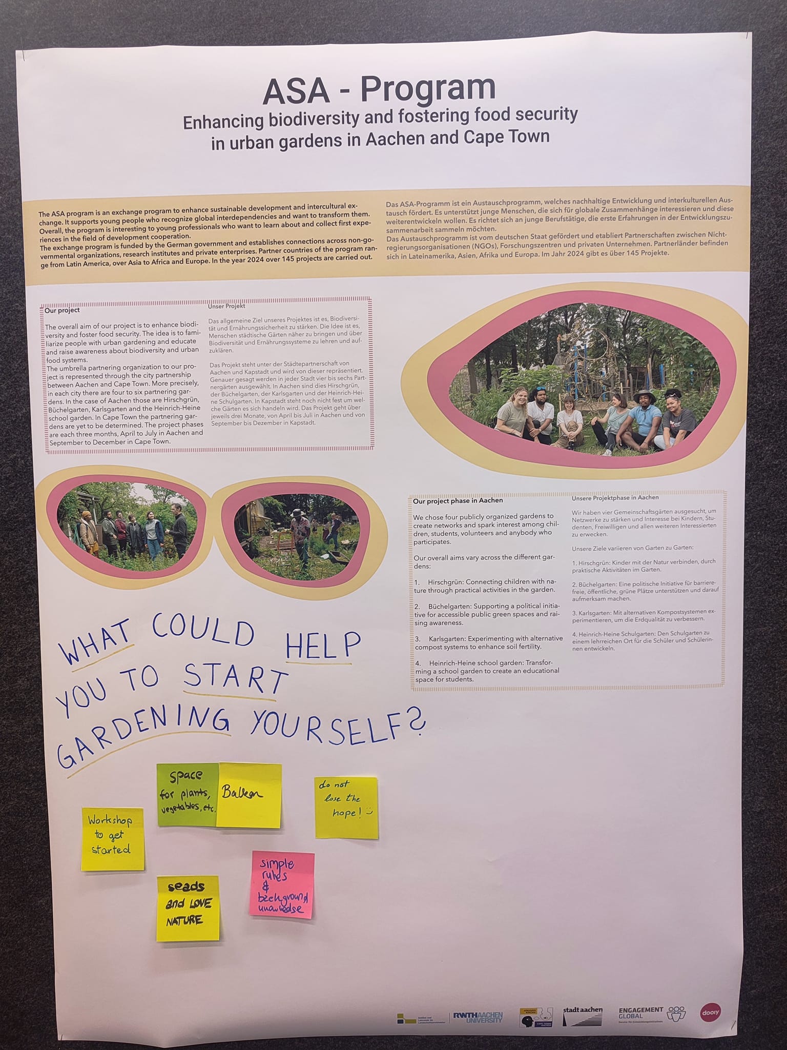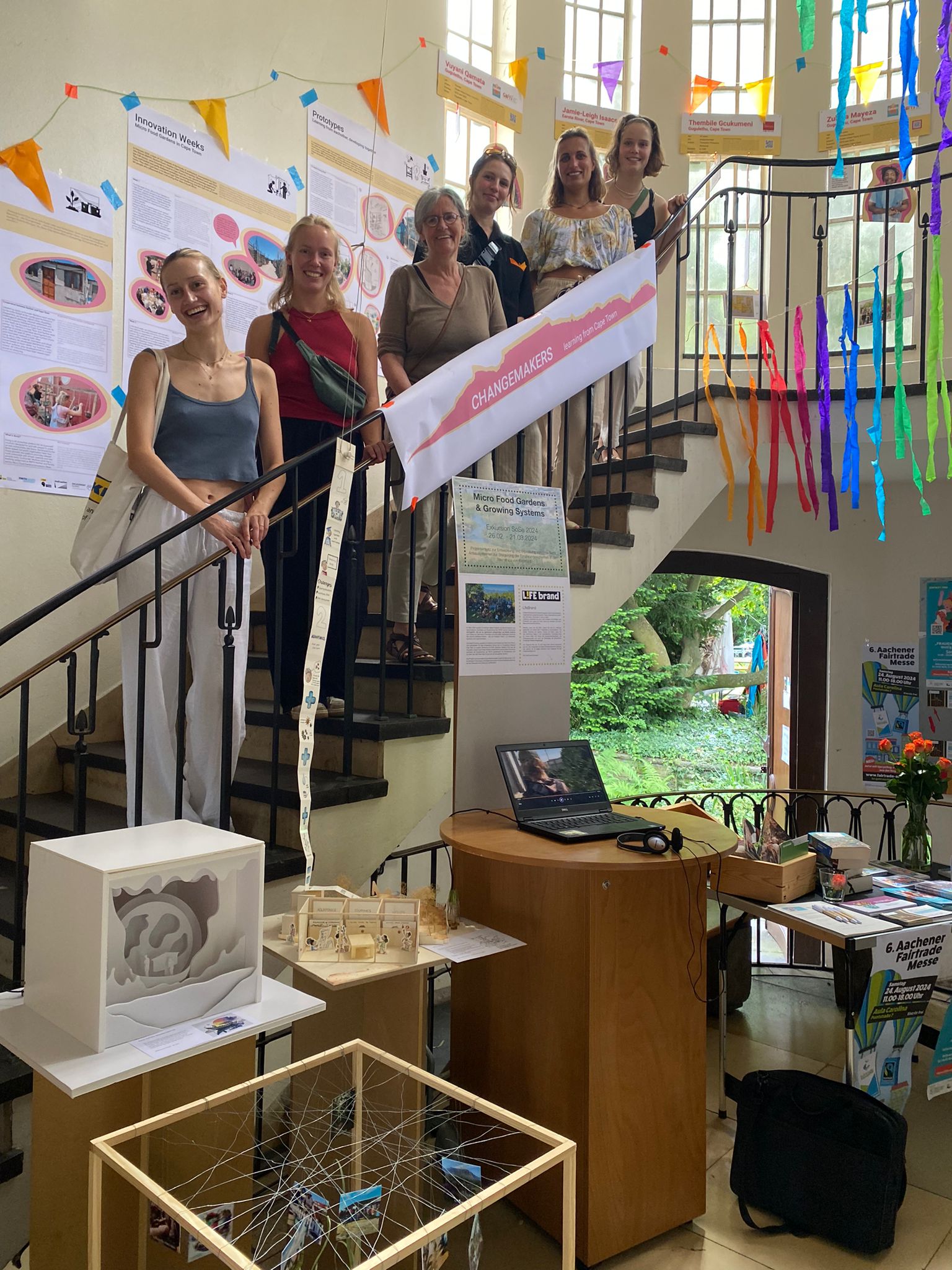 Den Auftakt machte die Eröffnungsveranstaltung im Reiff Foyer der Architekturfakultät der RWTH Aachen am 11.6.2024, die mit kurzen Erfahrungsberichten und der Filmpremiere der Projektdokumentation allen Besuchern einen persönlichen Einblick in ihre Zeit in Kapstadt vermitteln konnte. Am 29. Juni 2024 wurde die Ausstellung im Welthaus auf dem 38. Aachener Weltfest gezeigt. Im Treppenhaus des Welthauses hatten die Studierenden die Möglichkeit, die Changemakers Ausstellung in einem neuen Format noch einmal zu präsentieren. Die Ausstellung konnte so auf beiden Veranstaltungen einem interessierten Publikum vorgestellt werden. Seit Juli 2024 sind ausgewählte Exponate der Ausstellung im Schaukasten des Lehrstuhls für Landschaftsarchitektur in Stadtmitte an der Jakobstrasse 2 zu sehen.